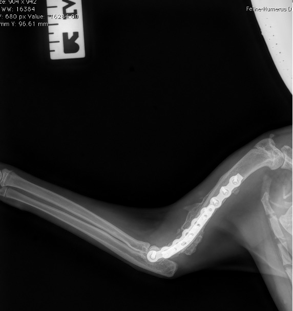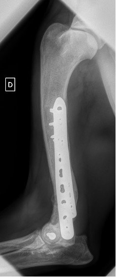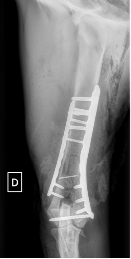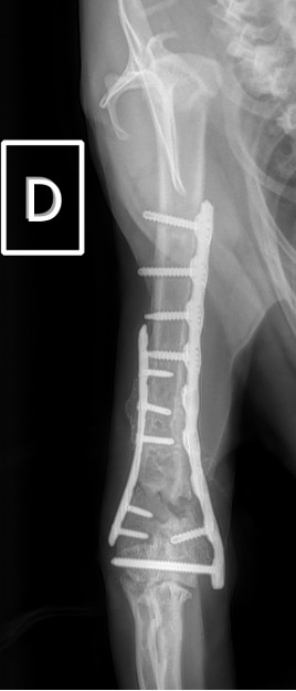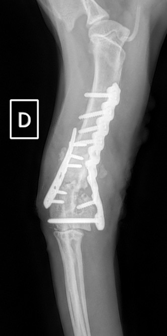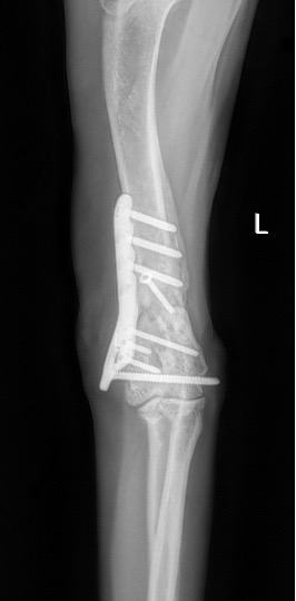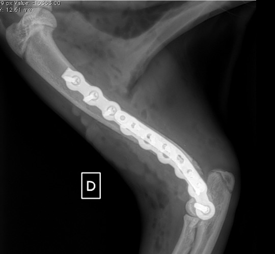 L’avènement récent des plaques anatomiques constitue une nouvelle option dans le traitement de ces fractures : dans l’exemple 3 (chat Ragdoll), une plaque anatomique médiale de 2 mm acceptant des vis de 1,6 et 2 mm a été utilisée seule avec succès.