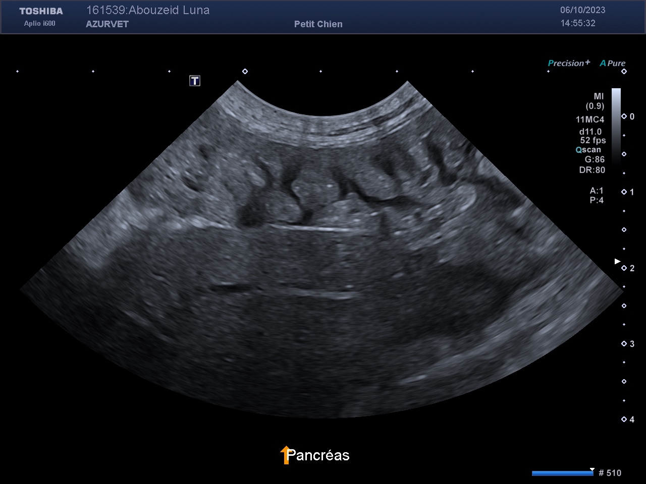 Figure 3 : échographie du pancréas d'un Cairn de 9 ans souffrant de lymphiectasie avec épaississement et aspect zébré du pancréas.