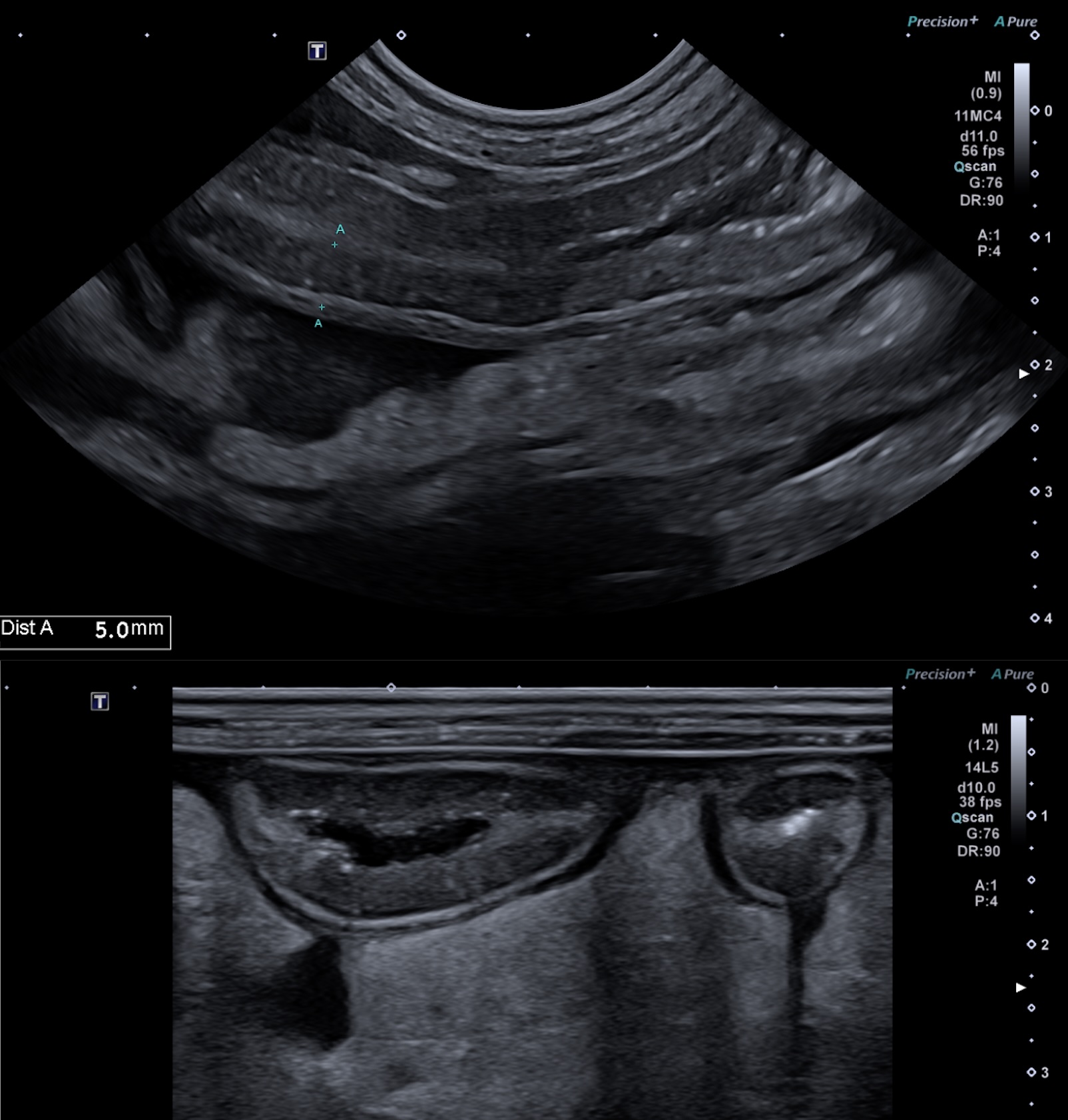Voici les images échographiques d'un Pinscher de 9 ans présenté pour diarrhée aigue depuis 4j avec hypoalbuminémie à 12g/L mise en évidence par le vétérinaire traitant.