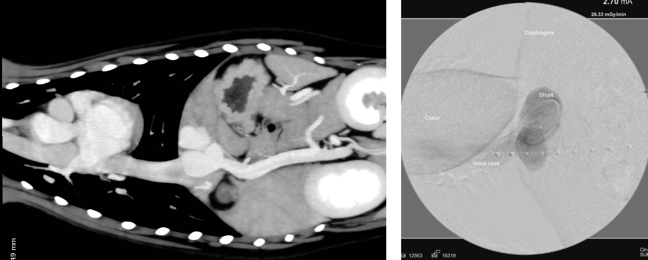 Une jeune chienne Border Collie de 8 mois présentée pour encéohalose hépatique a été diagnostiquée avec un shunt intra-hépatique de la division gauche du foie (persistance du ductus venosus), plus particulièrement le lobe latéral gauche. Le diagnostic a été établi après échographie et confirmation de l'anatomie précise du shunt par angioscanner triple phase.