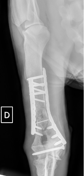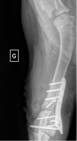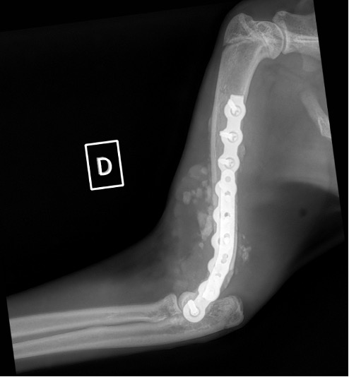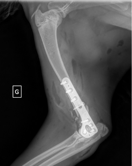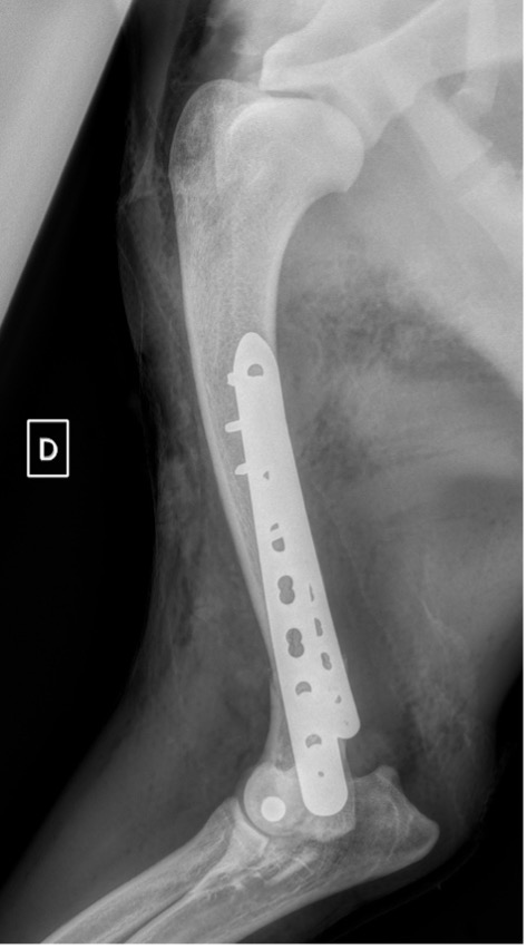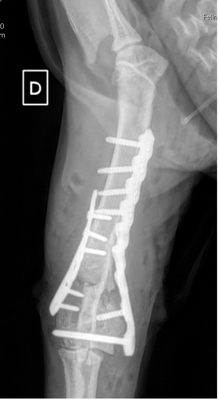 L’avènement récent des plaques anatomiques constitue une nouvelle option dans le traitement de ces fractures : dans l’exemple 3 (chat Ragdoll), une plaque anatomique médiale de 2 mm acceptant des vis de 1,6 et 2 mm a été utilisée seule avec succès.