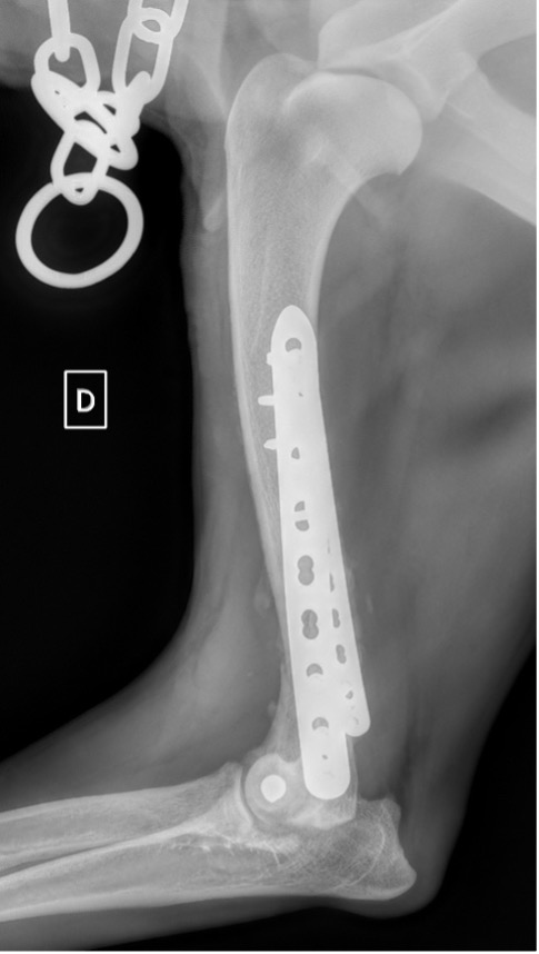 Notre préférence va vers le placement de deux plaques humérales : une médiale de la plus grande taille possible et l’autre latérale, généralement d’une taille inférieure à la première. Dans l’exemple 1 (chat européen), une plaque de 2 mm est utilisée médialement et une plaque de 1,5 mm latéralement. Dans l’exemple 2 (chien Malinois), une plaque de 3,5 mm est utilisée médialement et une plaque de 2,7 mm latéralement.