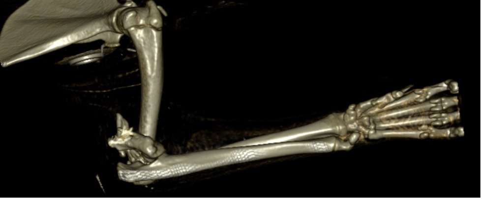 L’humérus distal est composé d’un condyle, de deux épicondyles (médiale et latérale) encadrant le foramen supratrochléaire (fermé chez le chat, présent mais occlus par une membrane chez le chien) et se poursuivant par le fût huméral proximalement.
