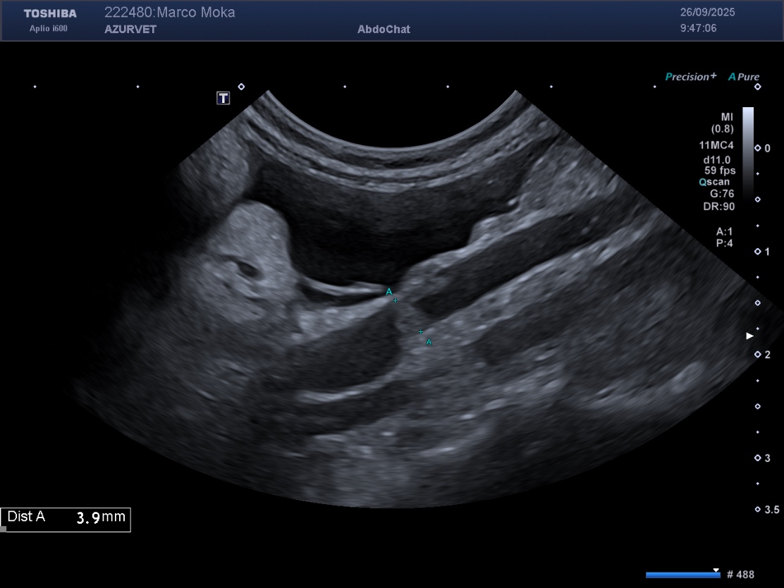 Voici les images échographiques d'un Pinscher de 9 ans présenté pour diarrhée aigue depuis 4j avec hypoalbuminémie à 12g/L mise en évidence par le vétérinaire traitant.