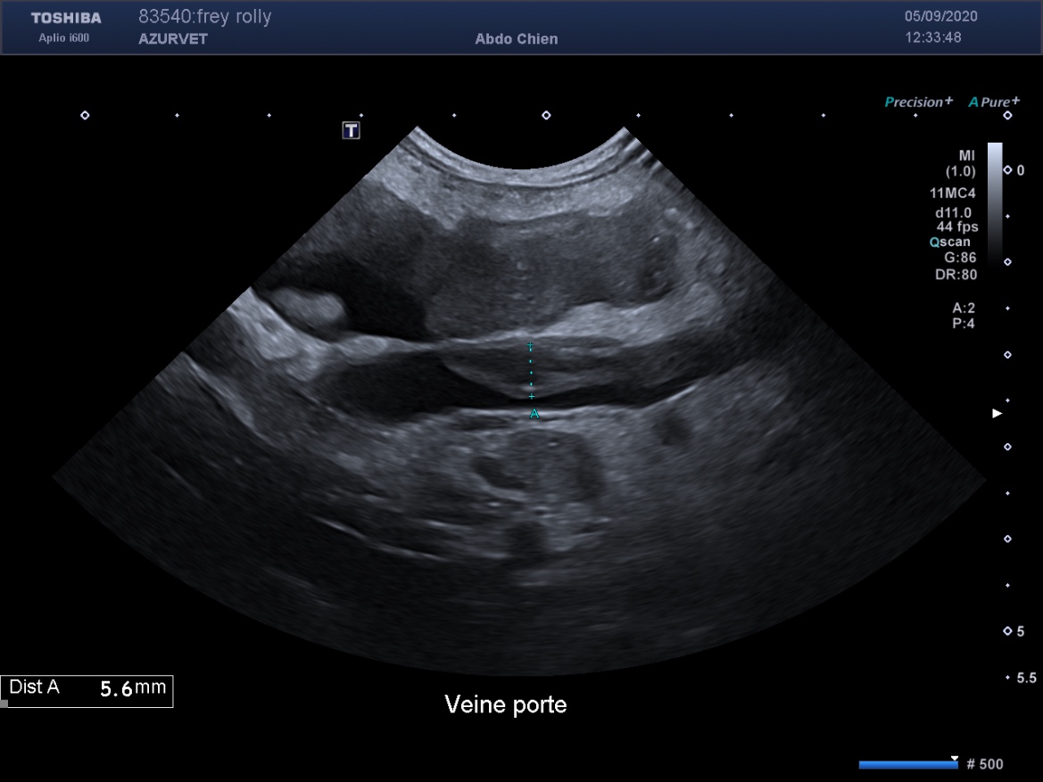 Figure 5 : thrombus porte sub occlusif chez un bouledogue français souffrant de lymphangiectasie.
