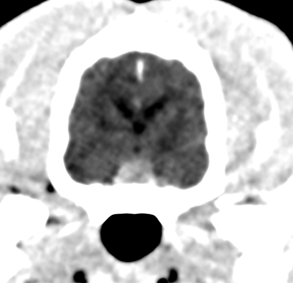 Images 1a & 1b : Image 1a (gauche) = Coupe transverse tomodensitométrique de l’encéphale, post-injection d’iohexol, montrant une masse pituitaire de 7,5mm d’épaisseur. Image 1b (droite) = Coupe transverse tomodensitométrique de l’abdomen montrant une augmentation de taille des surrénales bilatéralement.